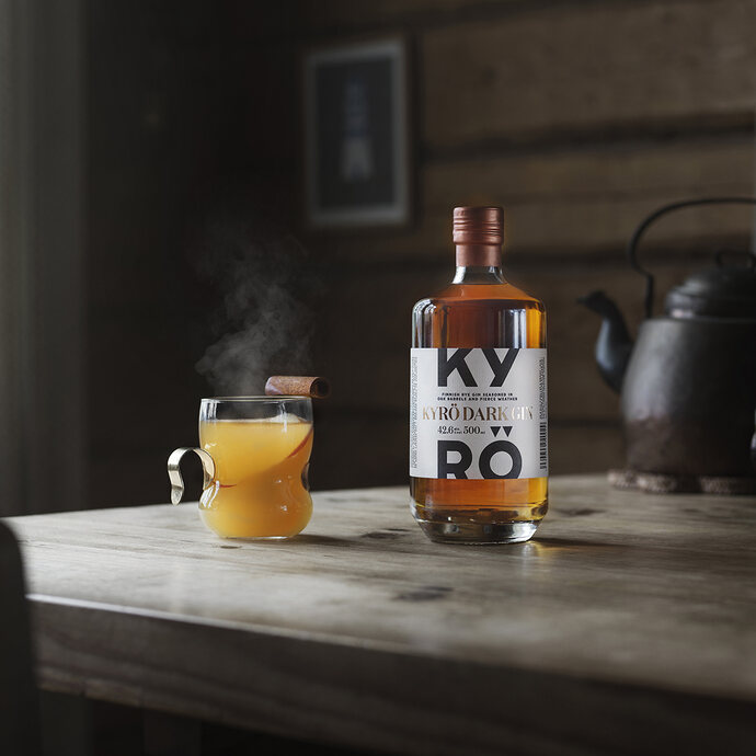 Goûtez le Kyrö Dark Gin chaud ou froid, avec du jus de pomme trouble ou du ginger ale – ou goûtez-le pur.
