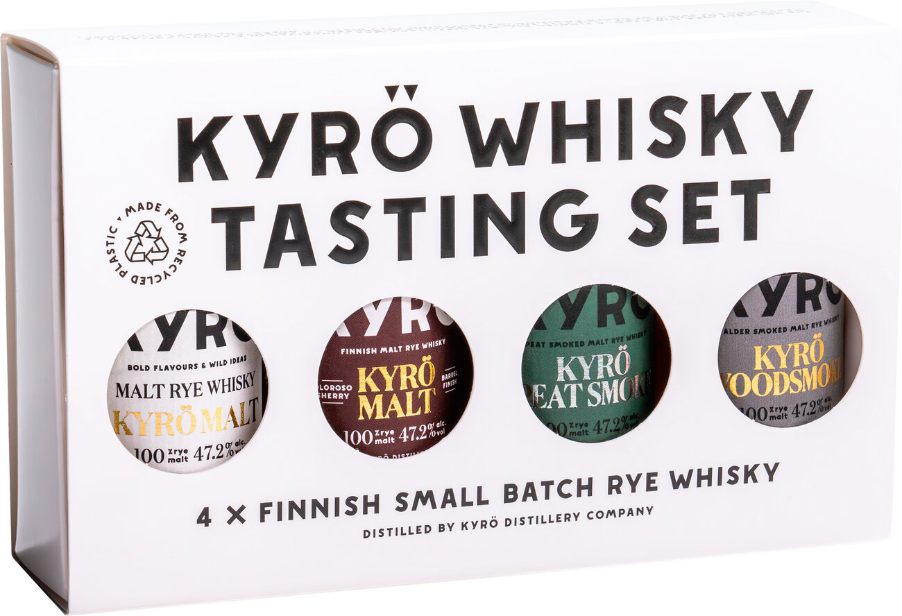 Le set contient quatre whiskies de seigle finlandais small batch de Kyrö.