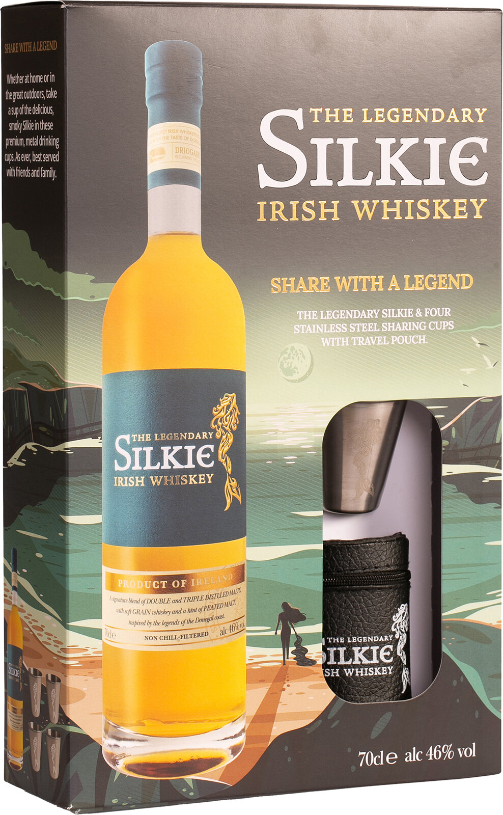 Diese Geschenkpackung enthält eine Flasche The Legenary Silkie (70 cl) sowie vier hochwertige Edelstahlbecher. Die Becher sind mit dem Silkie-Symbol der Meerjungfrau graviert und werden mit einem Reise-Kunstlederetui geliefert.